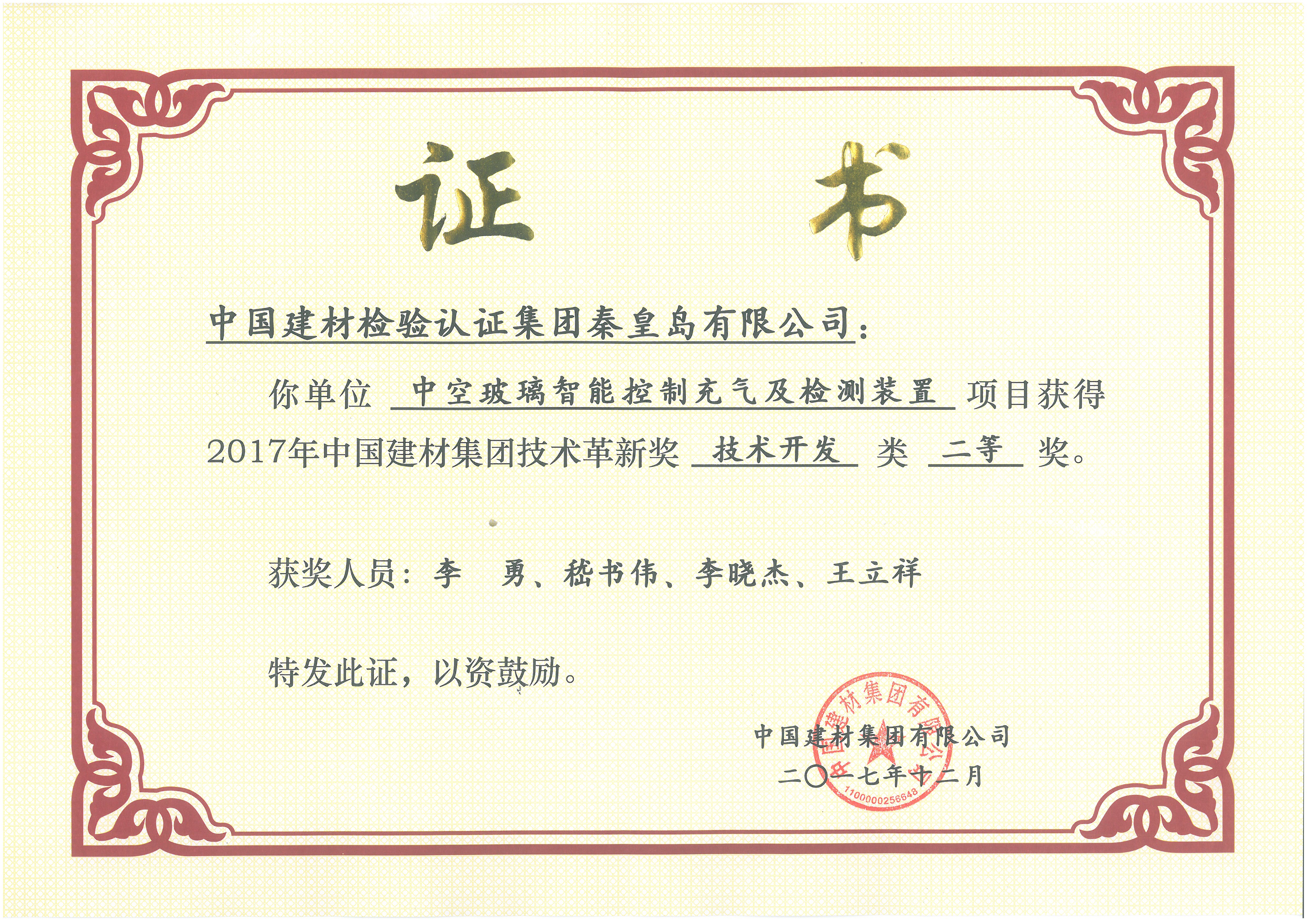 奖励名称:中国建材集团技术革新奖